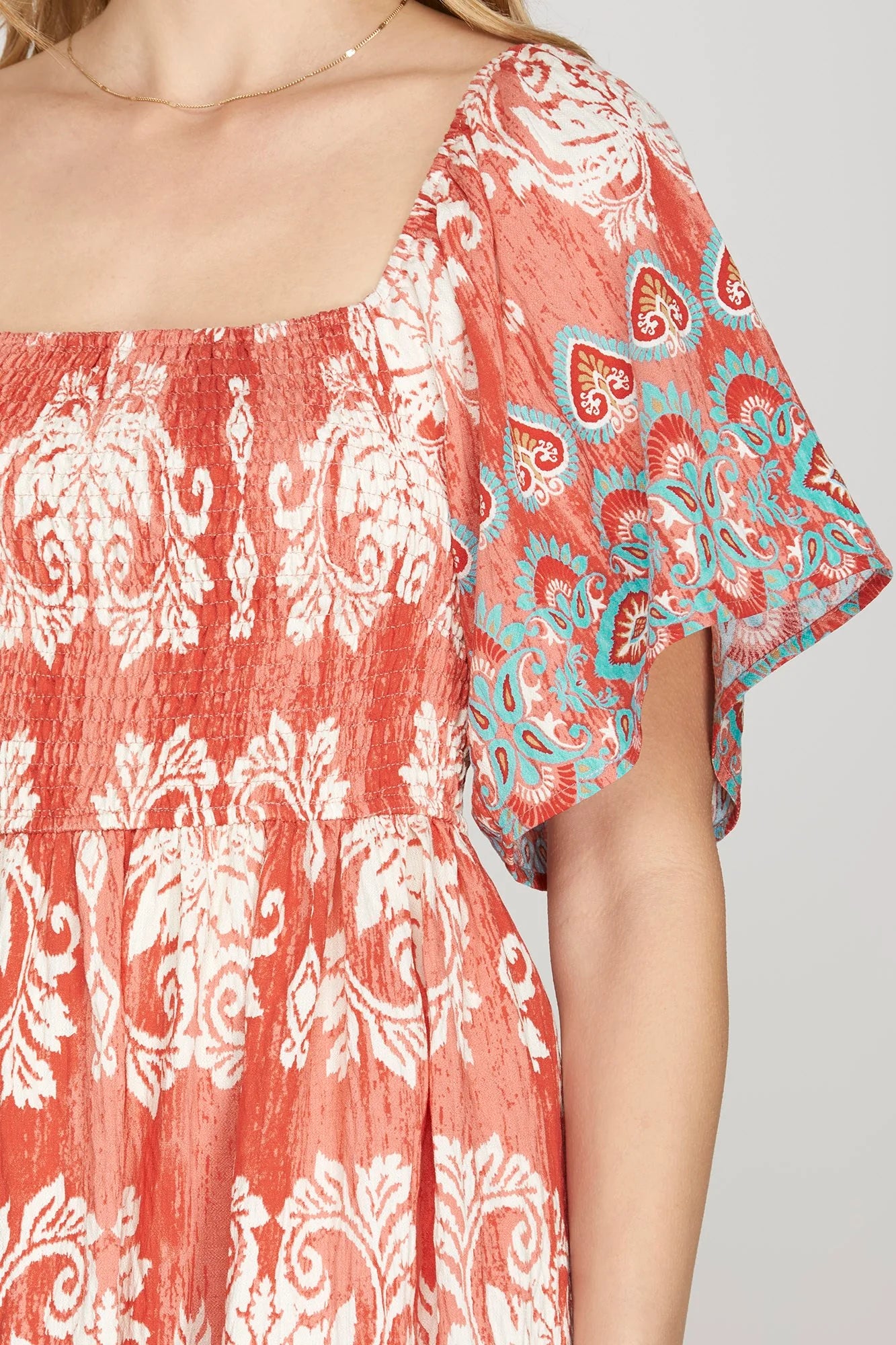 Red Smocked Border Print Woven Mini Dress | Playful Feminine Short Dress | Versatile Casual & Summer Event Silhouette