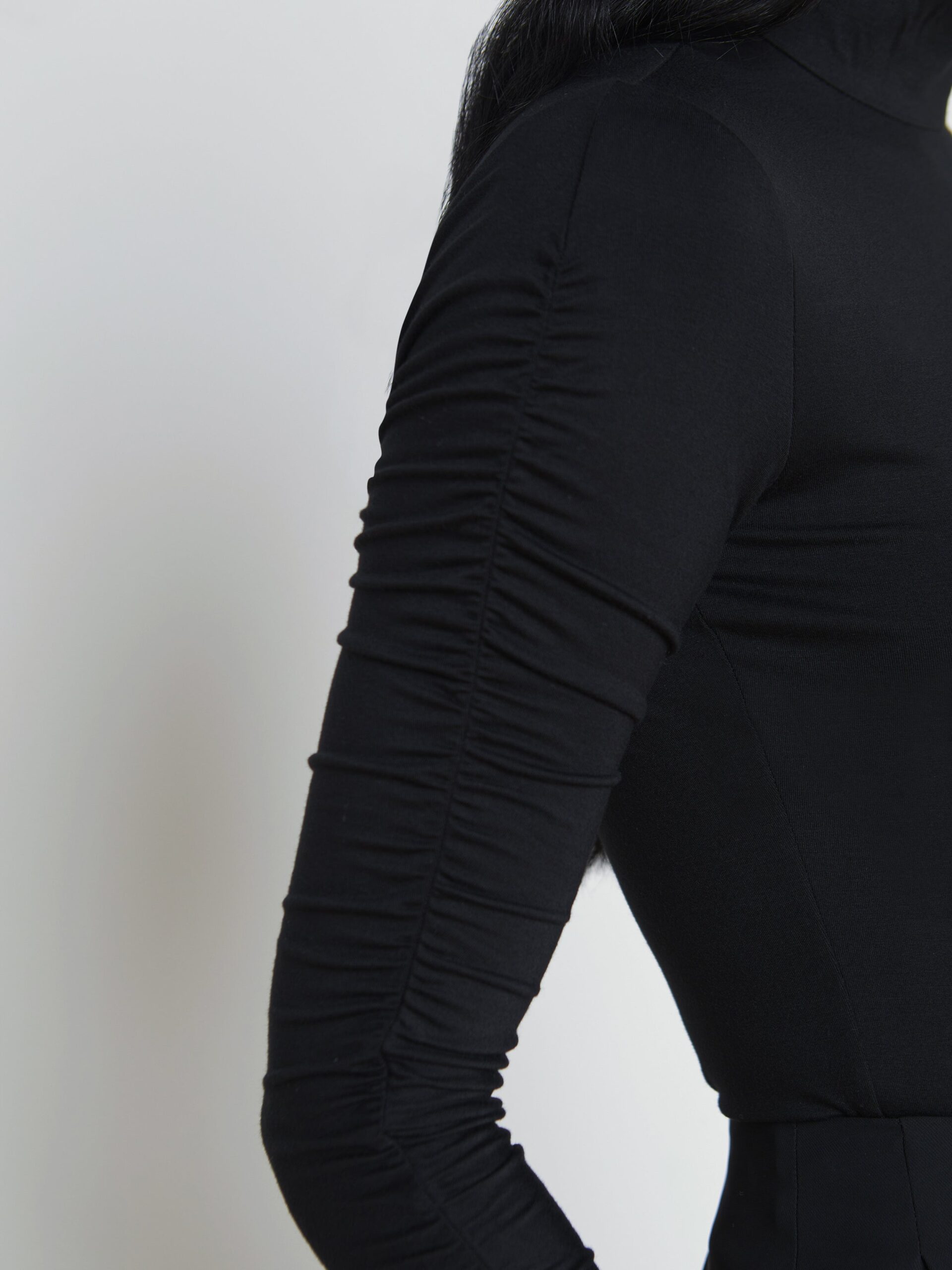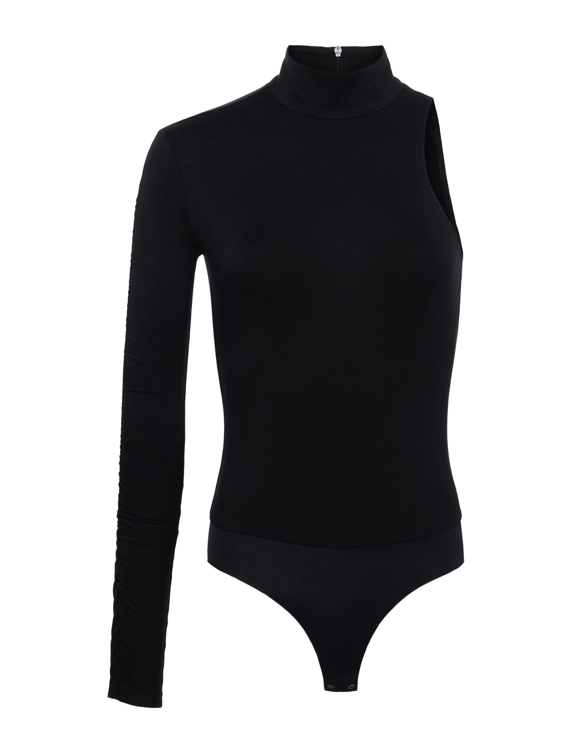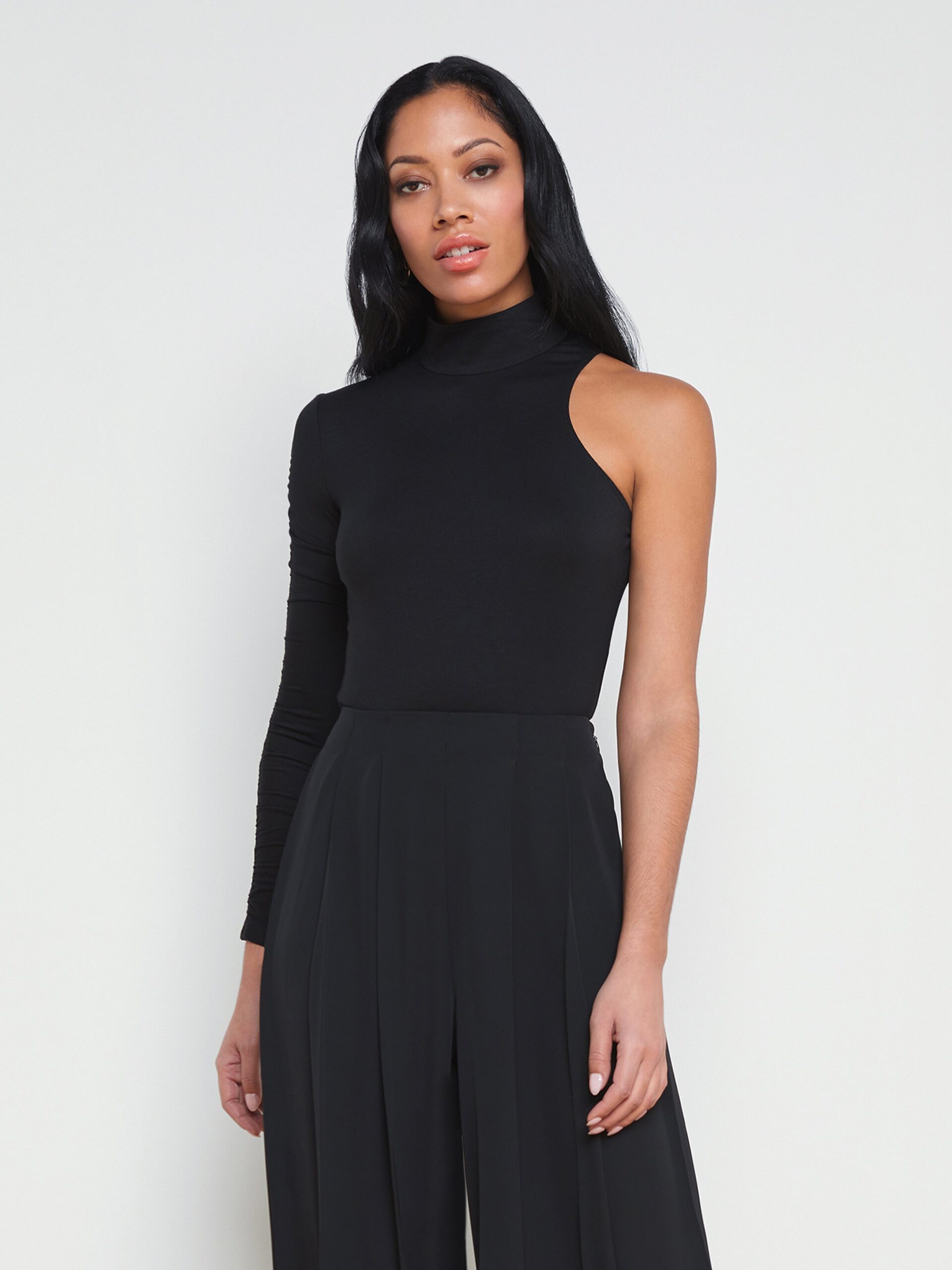 A single-sleeve design turns this classic look into a bold statement piece. The Lotti mock-neck bodysuit smooths the figure for sultry definition, and ruching along the single sleeve adds textural interest. Pair with our Nova pant for a dramatic special-occasion look.