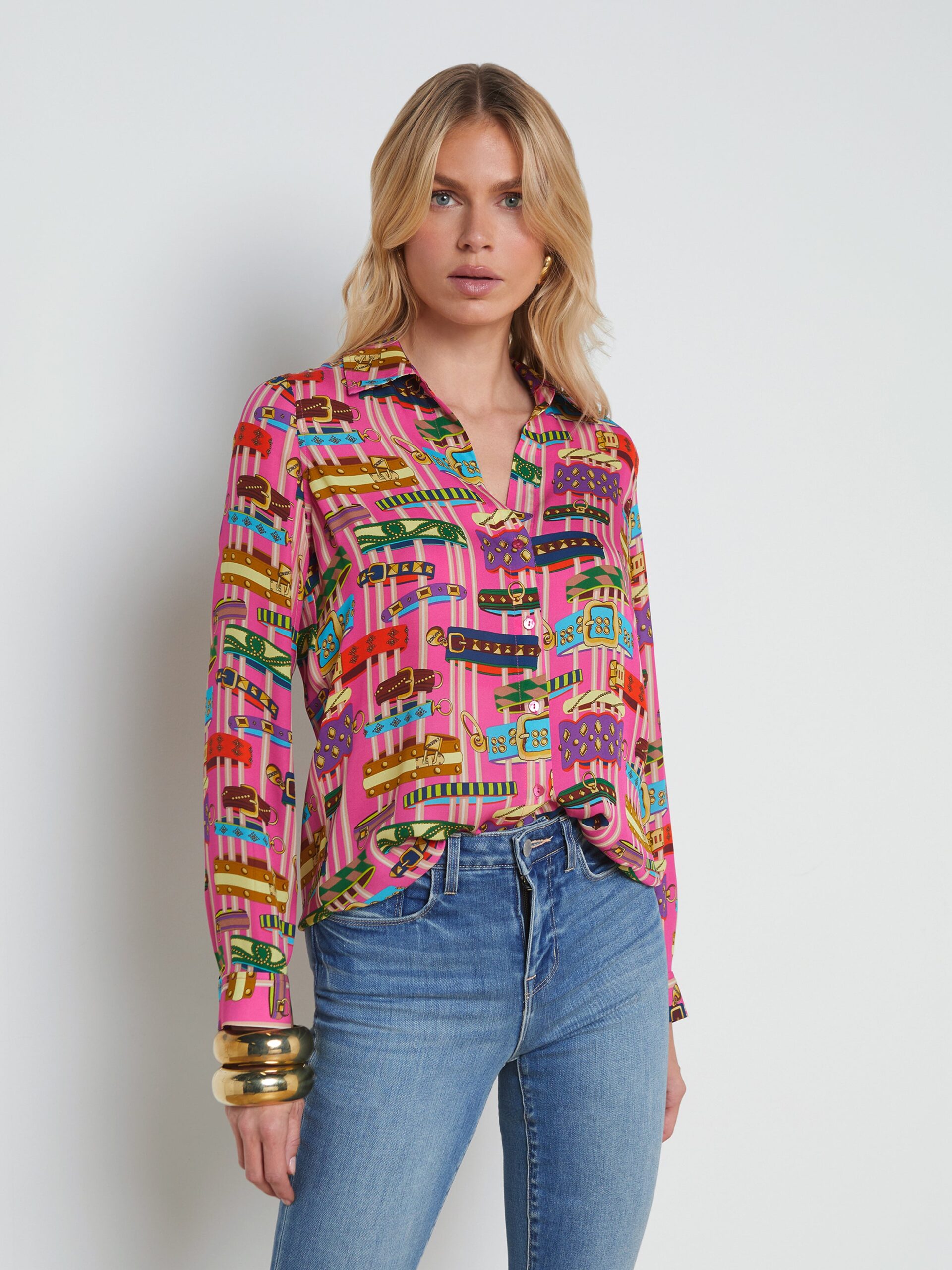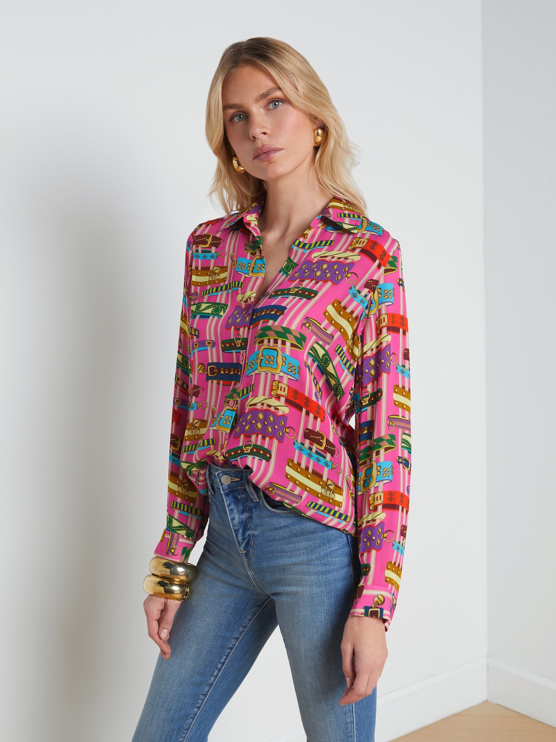 She’s a L’AGENCE favorite, now in a vivid bracelet print. The Nina silk button-down blouse is your go-to essential with a timeless relaxed fit and high-low shirttail hem. Pair with our Marguerite jean for everyday. Wear with our Maverick skirt and heels for office-ready style.