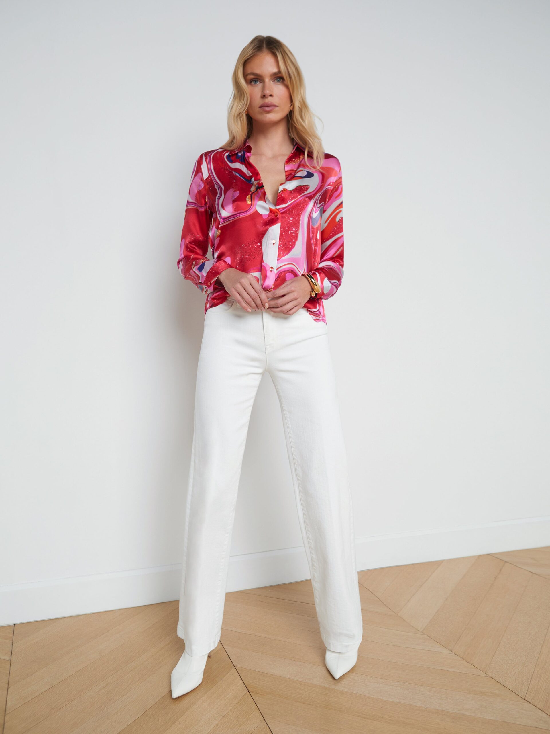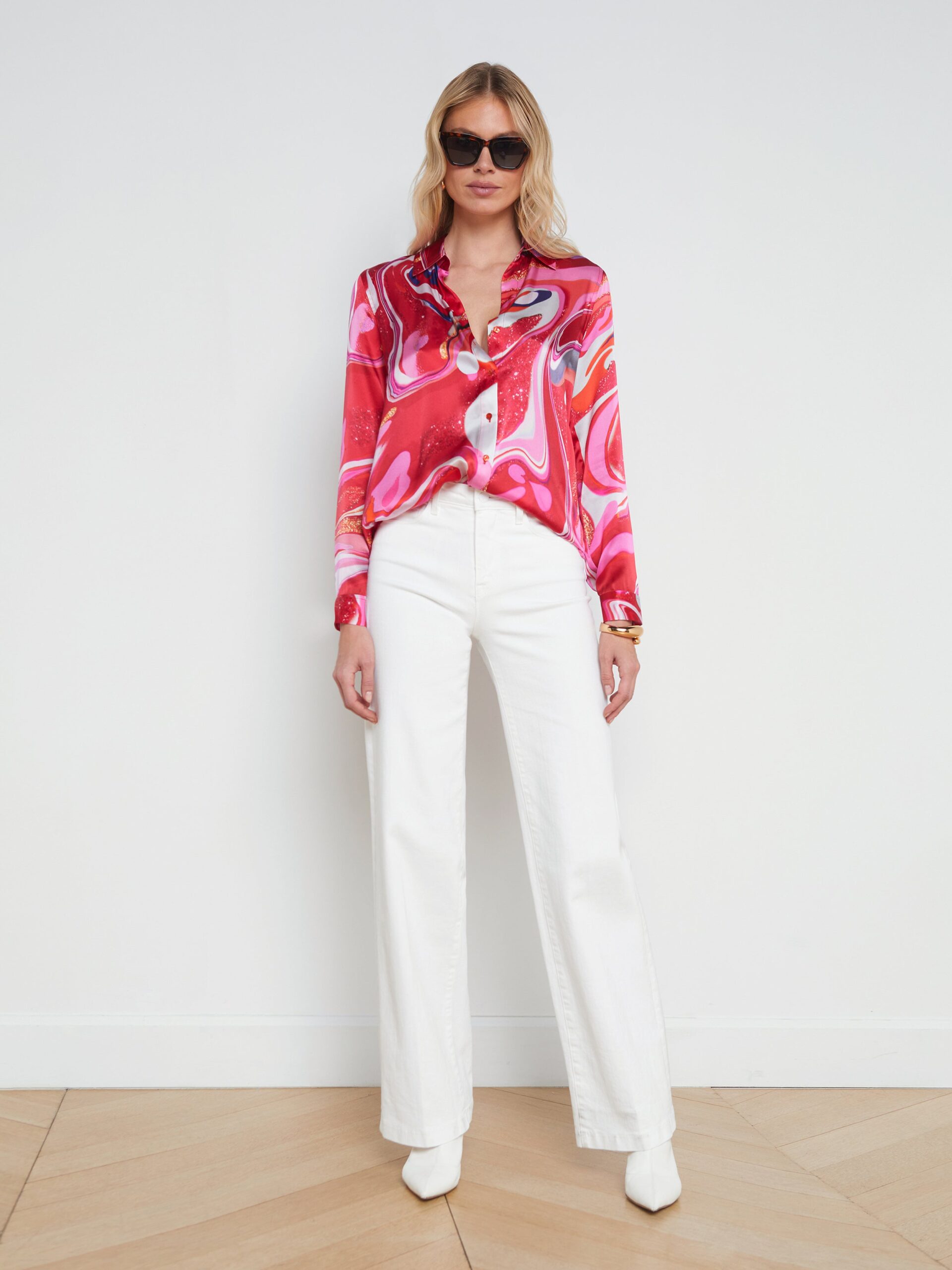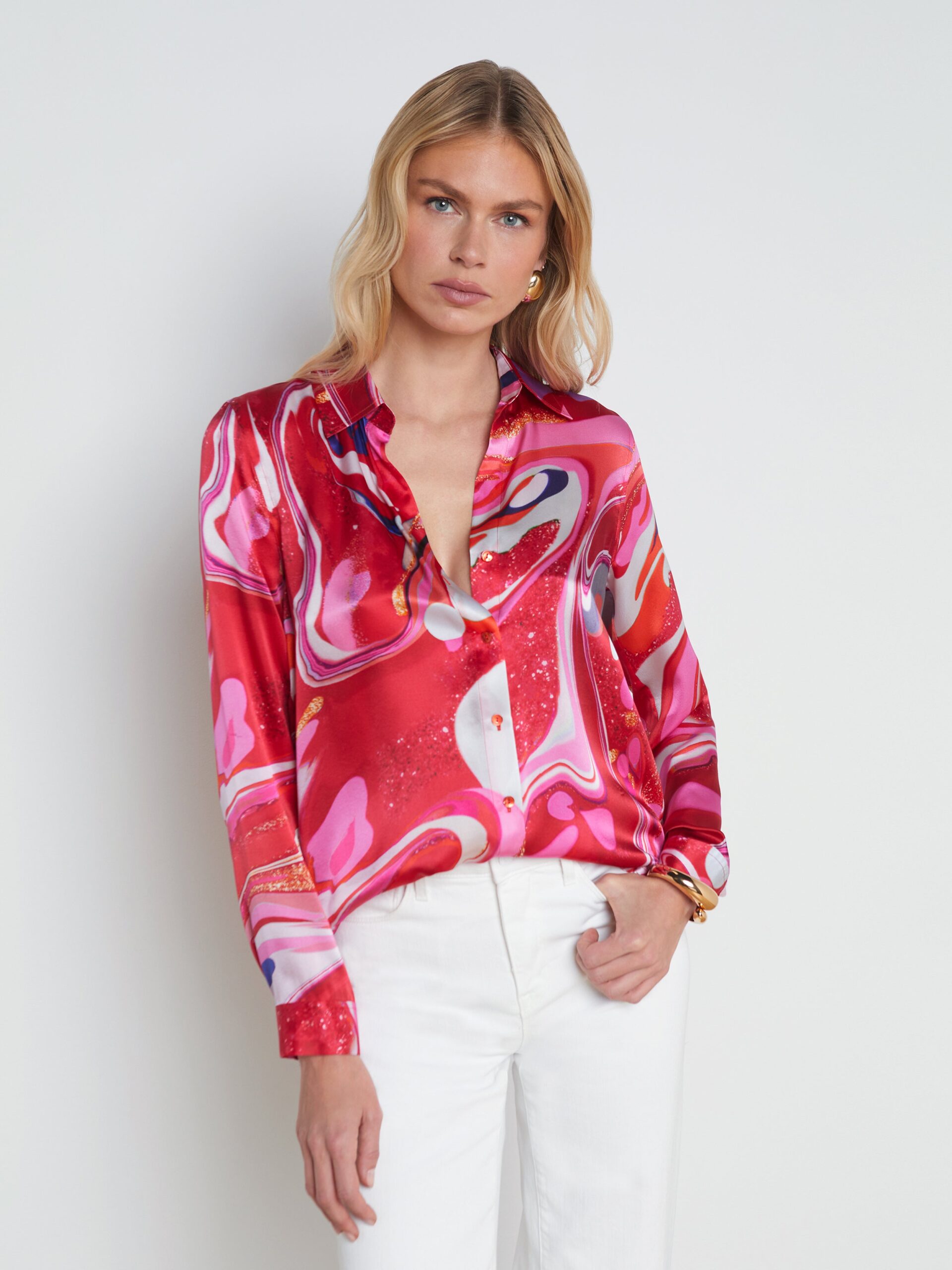 Our signature blouse offered in pure silk charmeuse. The Tyler keeps it timeless with details like a sharp collar, back pleated yoke, and long button-cuff sleeves. Offered in a range of fresh colorways and prints, there’s a Tyler for every occasion. Showcase the print by layering over white denim.